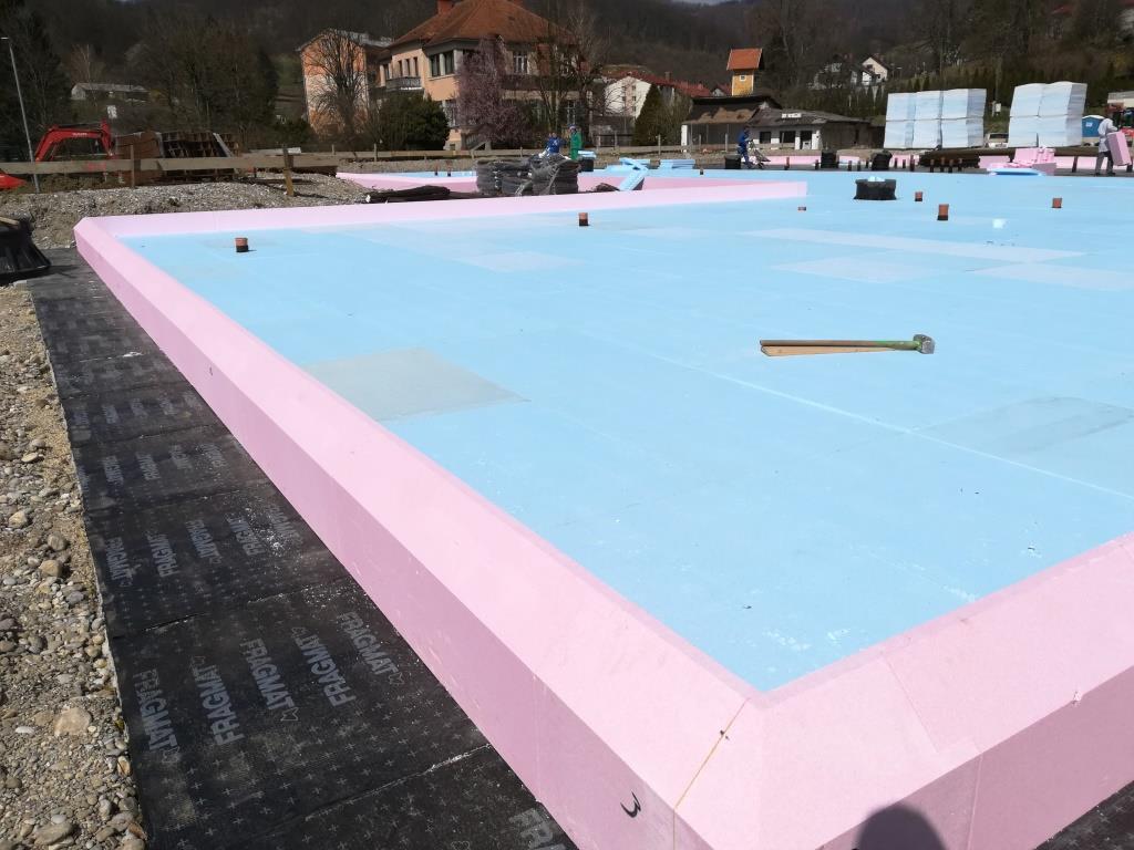 V začetku aprila je izvajalec Kostak d.d. kljub krizi zložil eno izmed naših površinsko večjih toplotnih izolacij pod temeljno ploščo za vrtec Senovo. Površina temeljne plošče je znašala nekaj manj kot 1200 m2. To je že drugi vrtec v občini Krško.