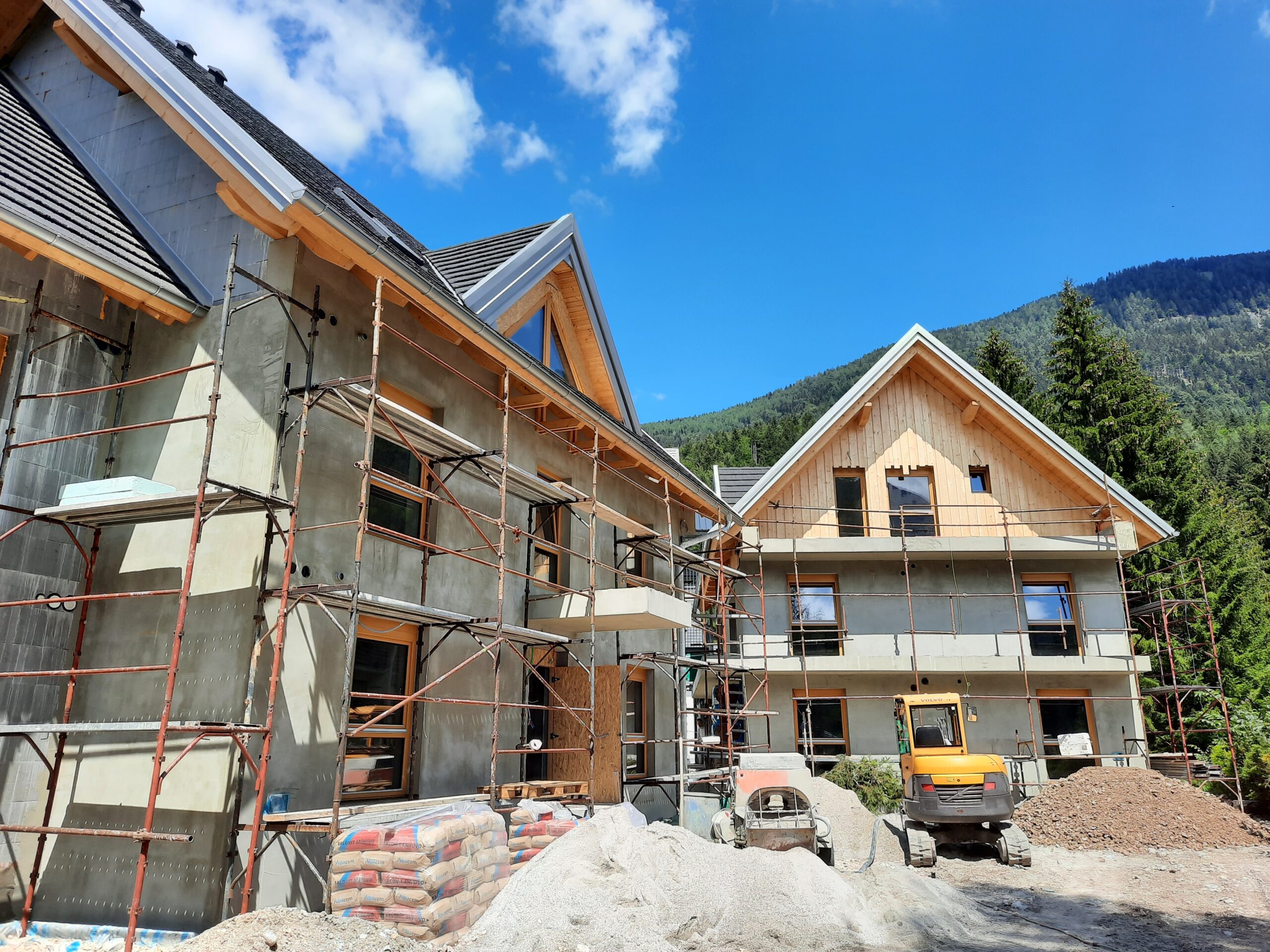 V Kranjski Gori se izvajajo fasaderska dela. Na objekte bo vgrajena tankoslojna, kontaktna fasada z JUB-ovim zaključnim silikonskim slojem v beli barvi, mansarde pa bodo obložene z vertikalnimi, globinsko impregniranimi deskami. V notranjosti objekta so že končani estrihi in stenski ometi. Prav tako potekajo tudi dela na zunanji ureditvi.
