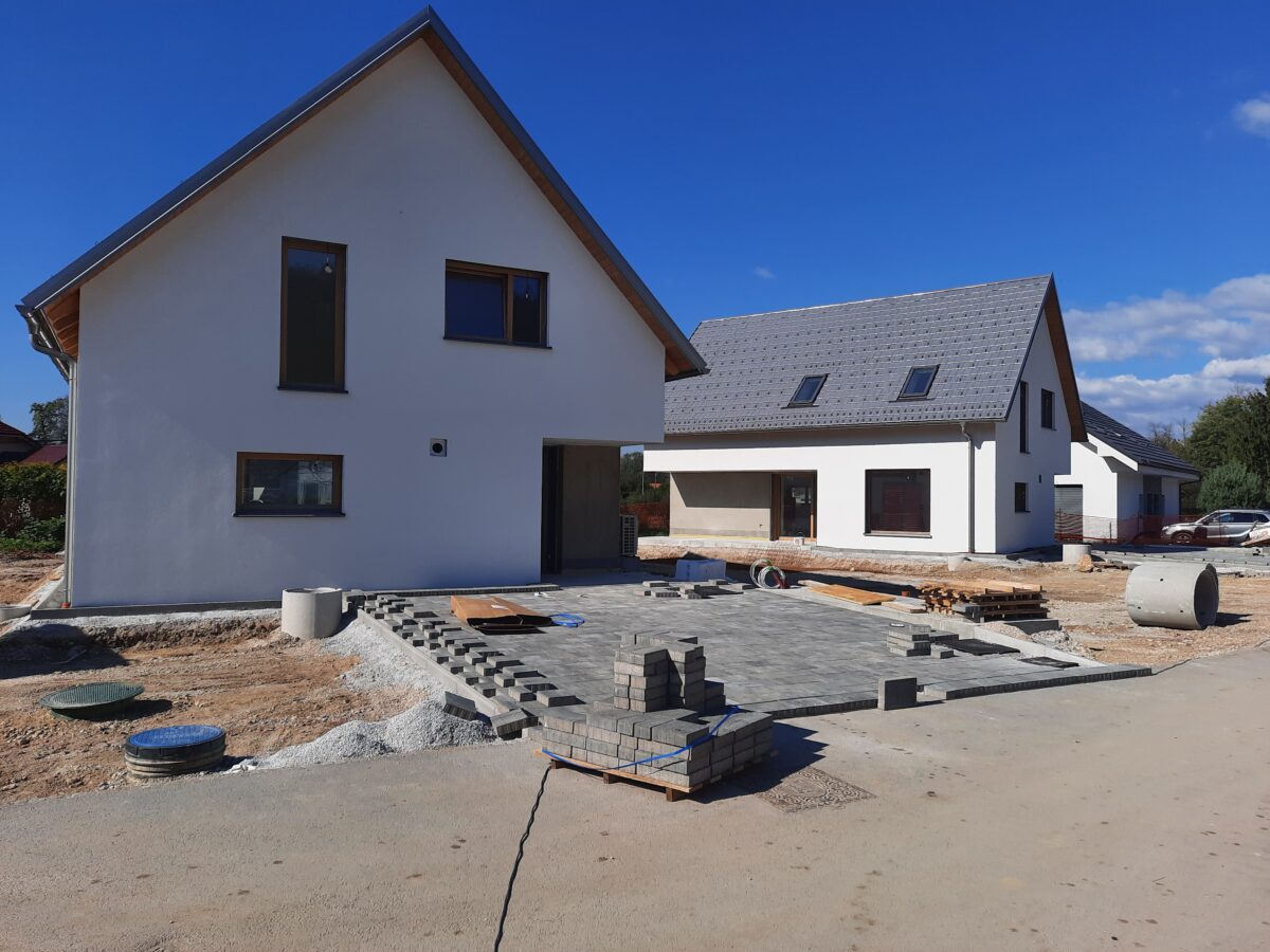 V lepem sončnem vremenu se nadaljujejo dela na zunanji ureditvi. Pričeli smo s polaganjem tlakovcev na povoznih površinah. Na fasado čaka še zadnji objekt.